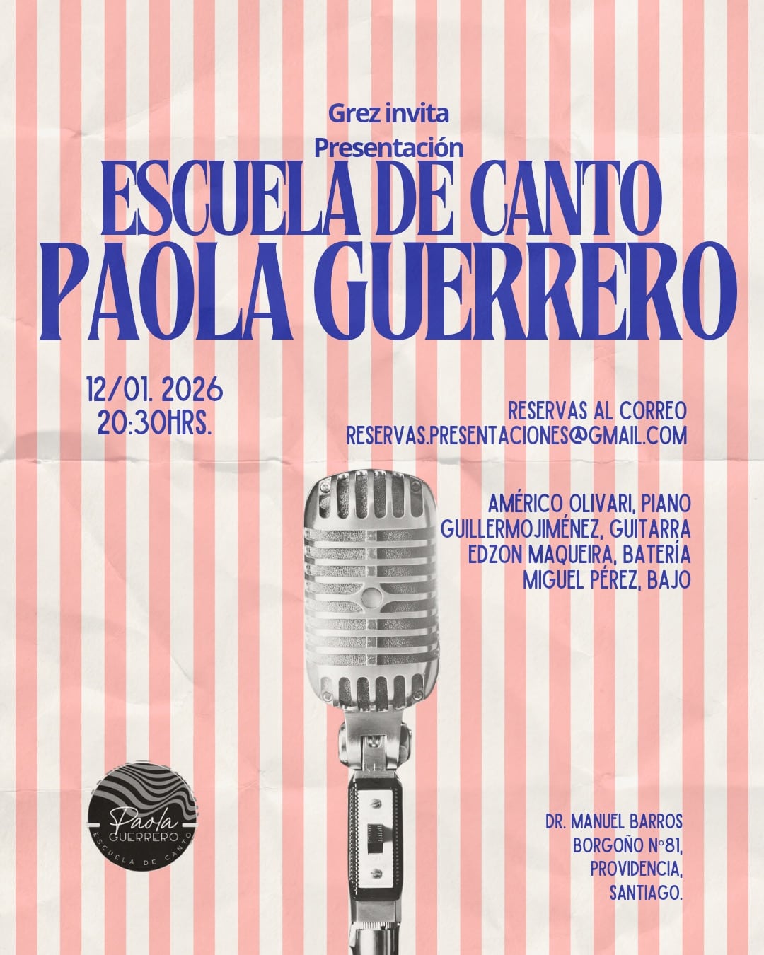 Bar Grez Dr. Manuel Barros Borgoño 81, SantiagoRESERVAS AL CORREO RESERVAS.PRESENTACIONES@GMAIL.COM AMÉRICO, OLIVARI, PIANO GUILLERMO JIMÉNEZ, GUITARRA EDZON MAQUEIRA, BATERÍA MIGUEL PÉREZ, BAJO