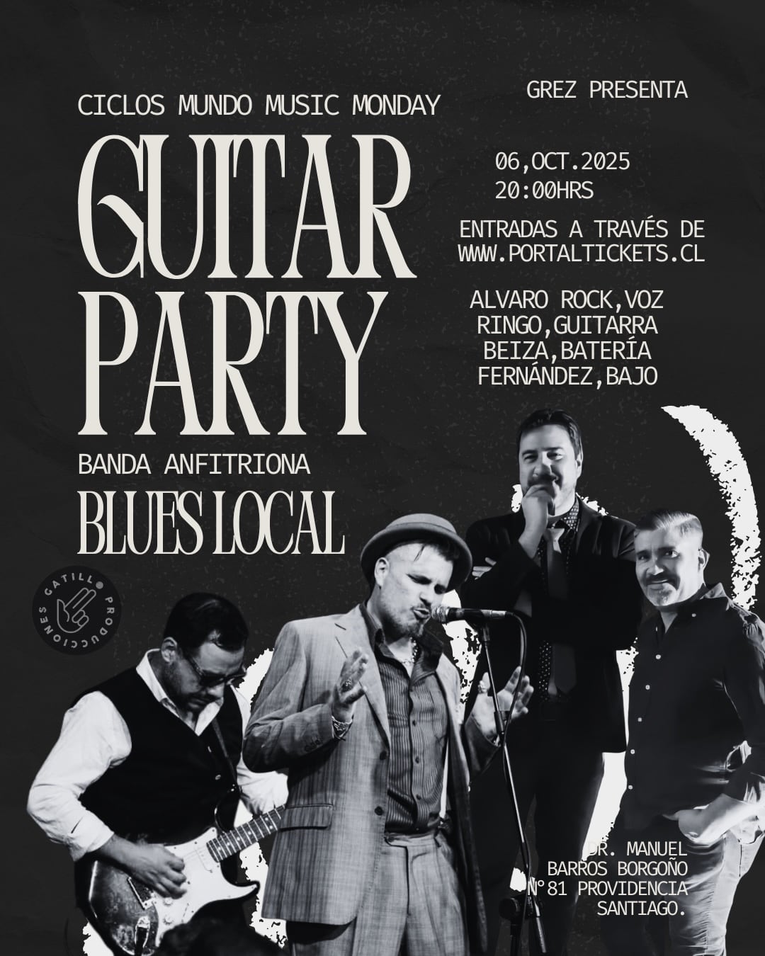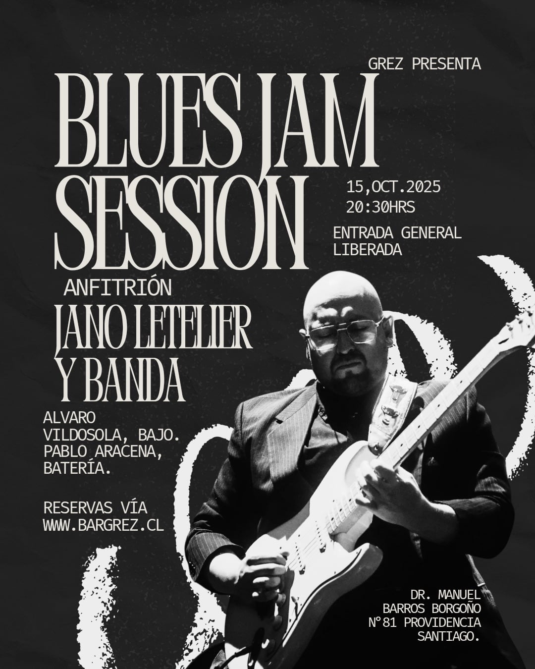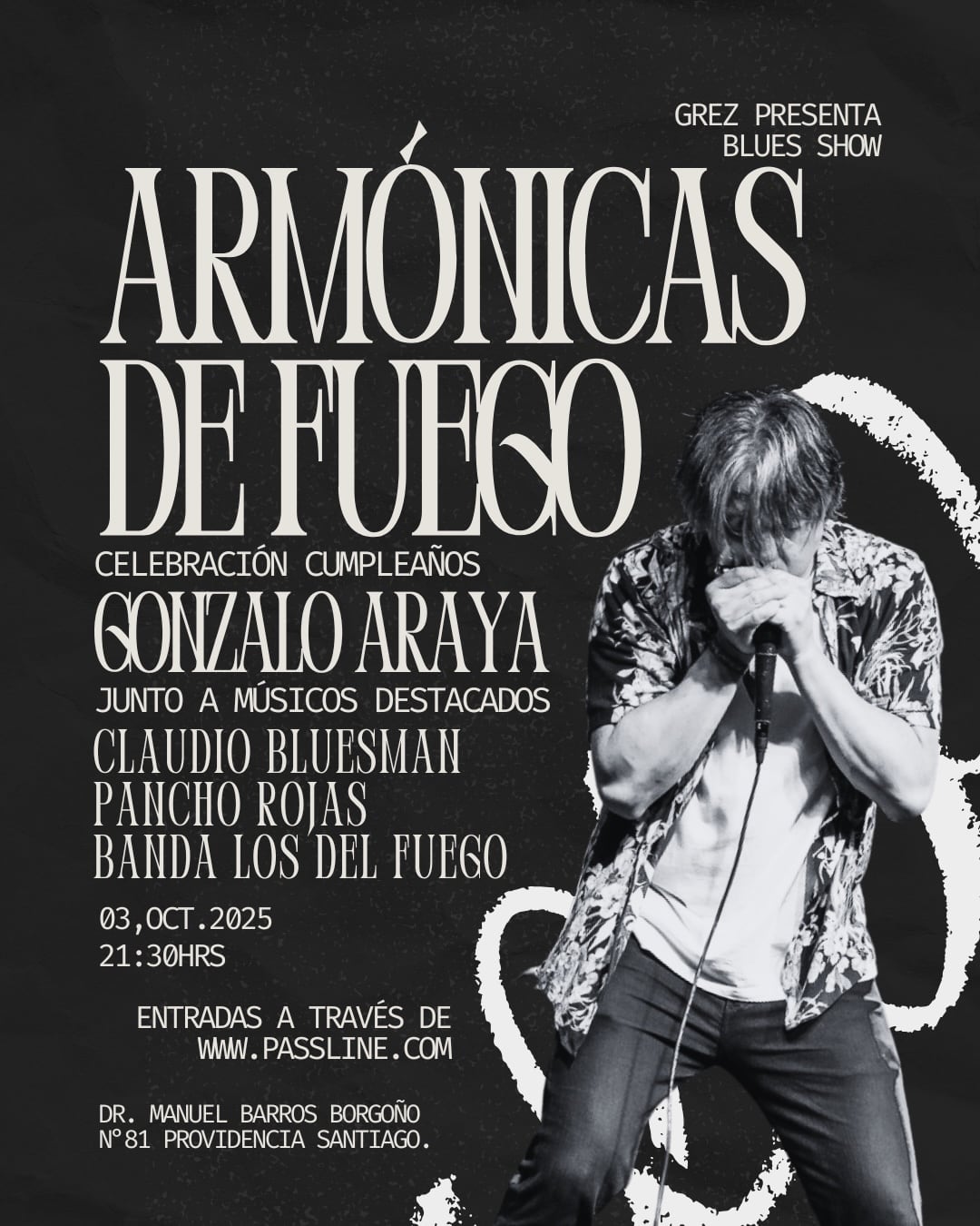 Bar Grez Dr. Manuel Barros Borgoño 81, Santiago, ChileEl evento “Armónicas de Fuego” reúne a tres leyendas vivientes del blues chileno en un escenario único. Claudio Bluesman, voz y armónica de la banda El Cruce, Pancho Rojas, carismático líder de Capitán Corneta, y Gonzalo Araya, se encuentran para dar vida a un concierto que promete intensidad, improvisación y mucha alma. En esta ocasión, […]