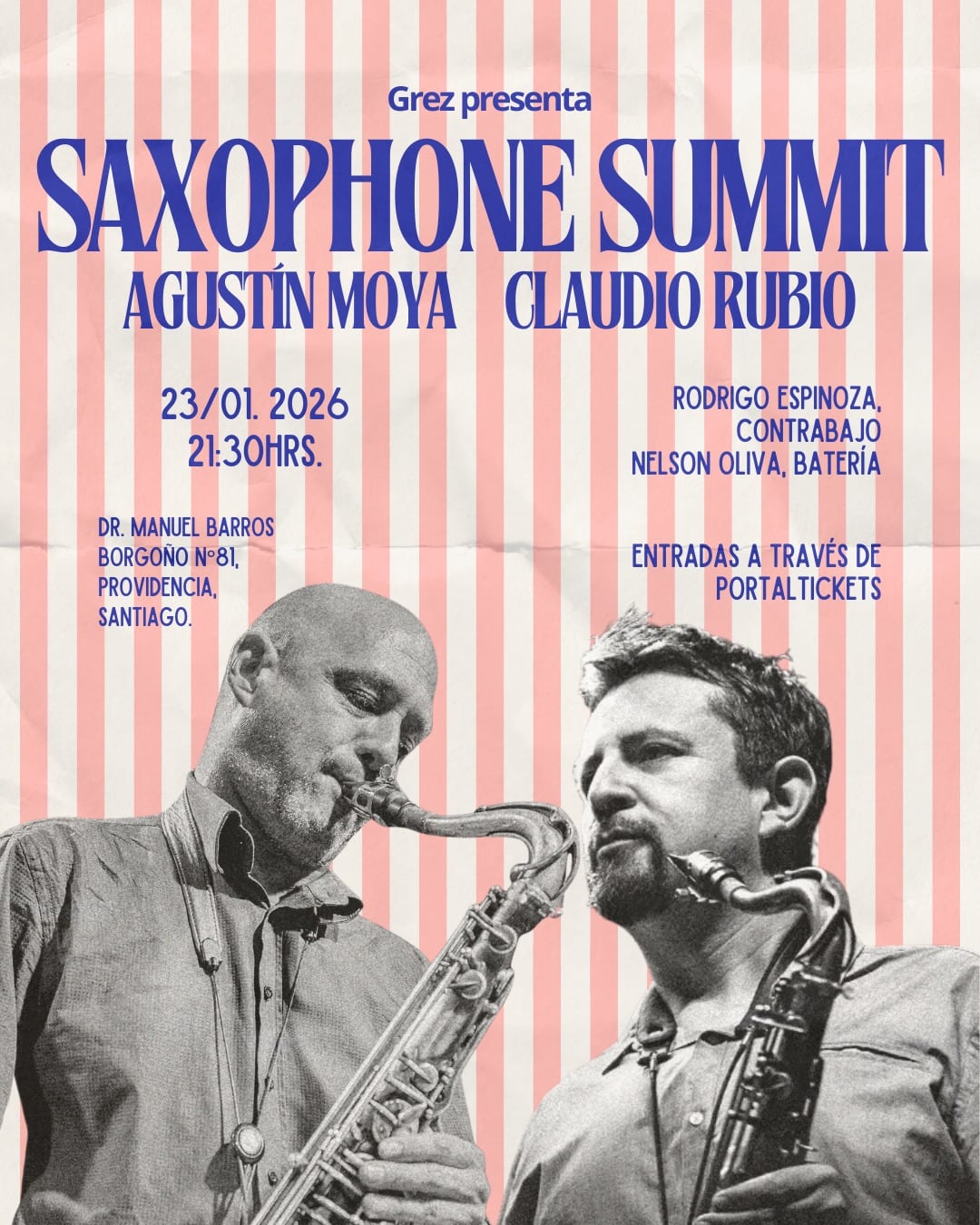 Este viernes 23 de enero a las 21:30 hrs., el escenario de Grez Restaurante recibe Saxophone Summit, un encuentro imperdible que reúne a dos de los saxofonistas más influyentes del jazz chileno: Agustín Moya y Claudio Rubio. Acompañados por Rodrigo Espinoza en contrabajo y Nelson Oliva en batería, el cuarteto presentará un repertorio especialmente preparado […]